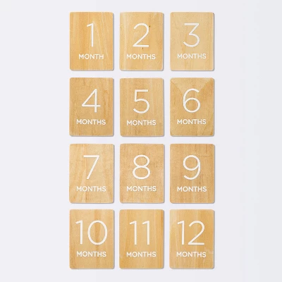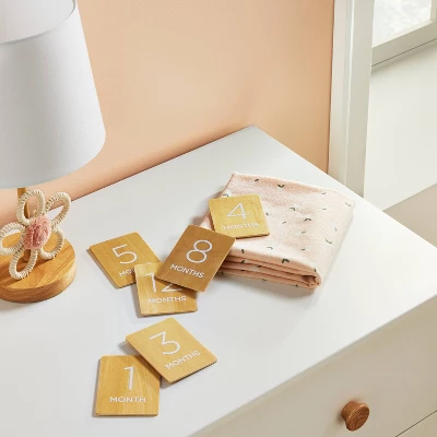 Show off your child’s monthly milestones during their first year with these Monthly Milestone Cards from cloud island™. This set of six double-sided cards features a wood design with a natural backdrop and white numbers and letters. They include the numbers 1 through 12 and the word “months” and are the perfect complement to any shelf or dresser display.